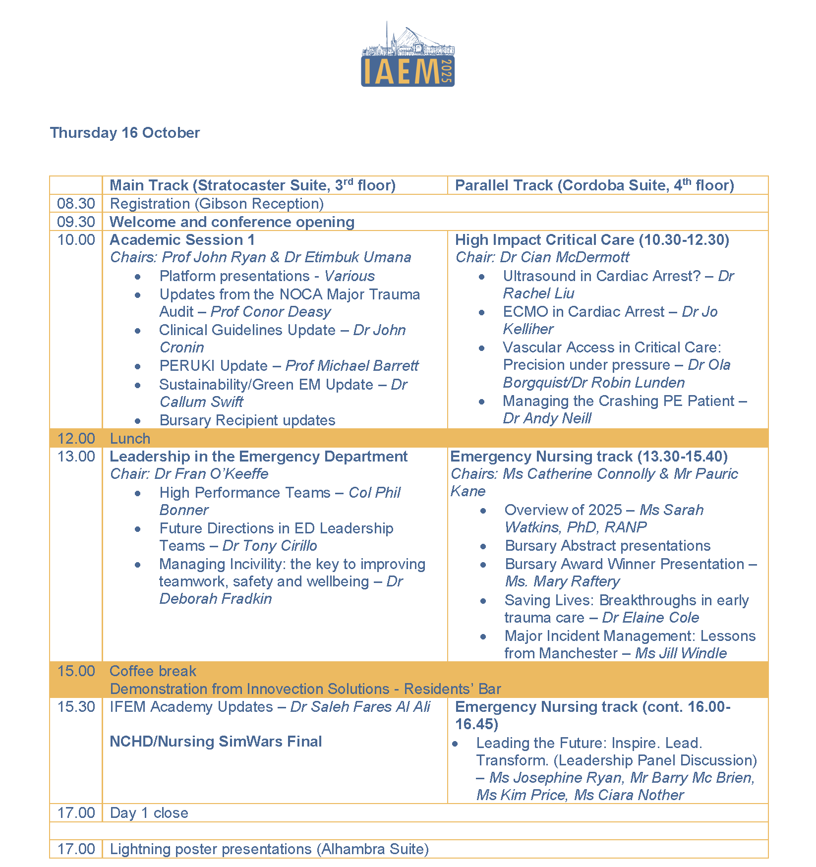 IAEM hosted its first sell-out ASM in the Gibson Hotel, Dublin, on Thursday 16th and Friday 17th October 2025. With more than 400 delegates attending, an esteemed line-up of Irish and international speakers covered a wide variety of topics including Emergency Nursing; Pre-Hospital EM; the Use of AI in EM; and, in the Trauma Forum, the impact of violence and knife crime.